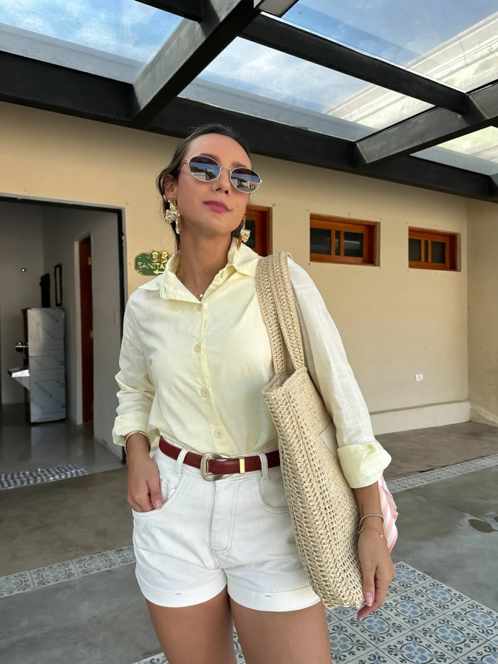 Camisa em viscose com botões na parte frontal, com gola colarinho, e botões no punho.
