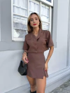 Conjunto feminino confeccionado em tecido leve e fresco. O tecido garante um caimento leve e um toque mais macio. A peça possui short com zíper no entremeio, e colete alongado com faixa para amarração na cintura.