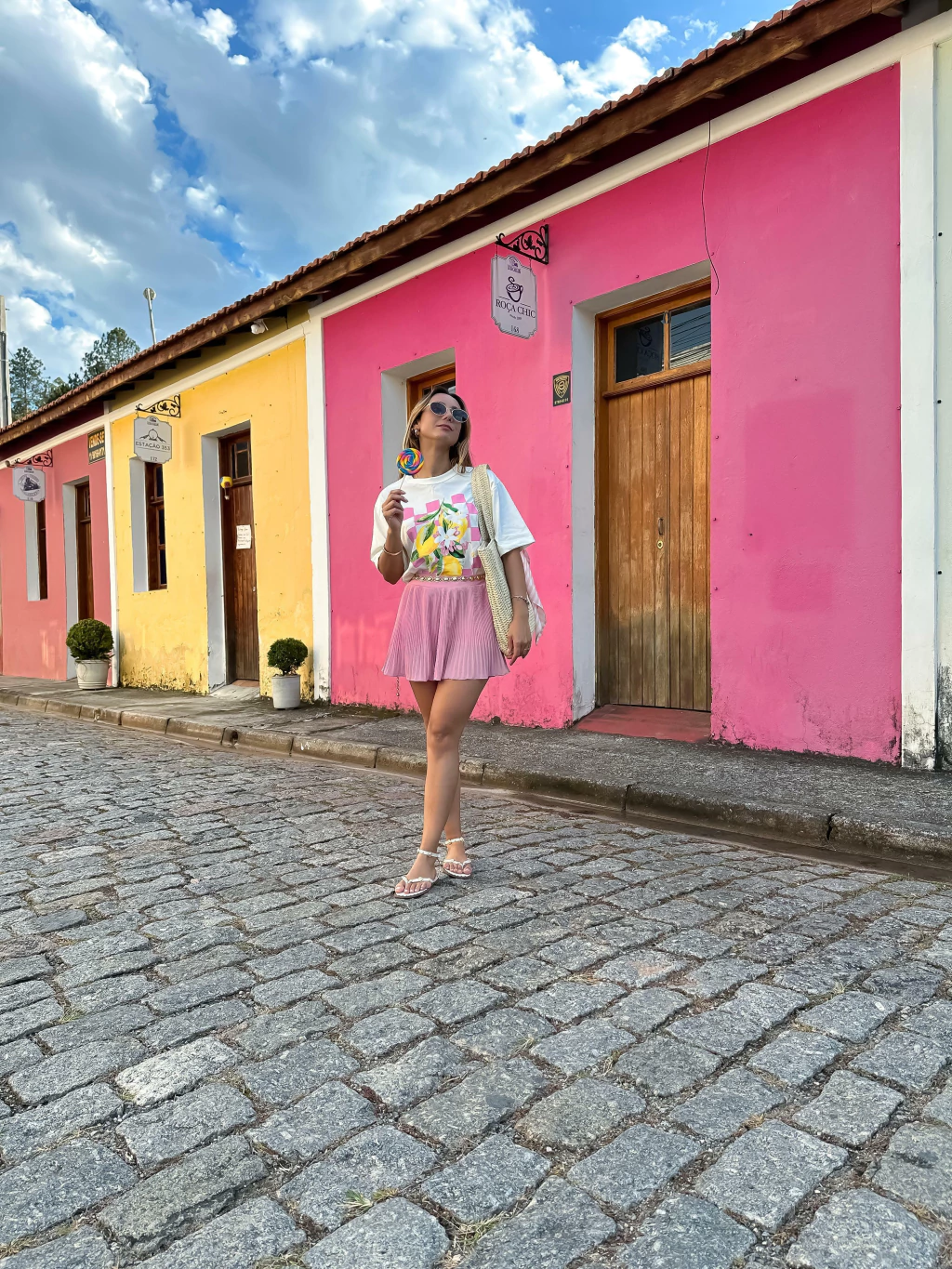 Short saia no tecido plissado, conhecido por ser um tecido leve e caimento fluído.